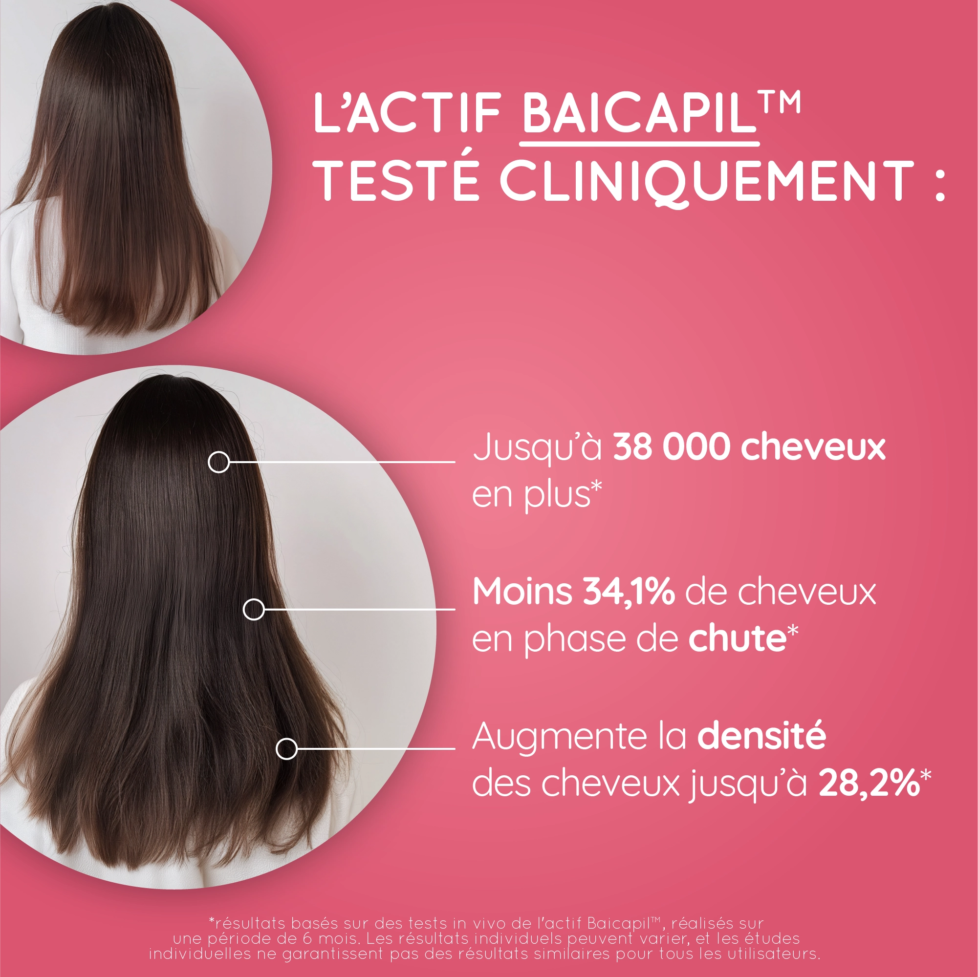 *Résultats sur l’actif Baicapil™, issus de tests réalisés par un laboratoire indépendant sur un produit équivalent. Test in vivo – 31 volontaires de 18 à 60 ans présentant une alopécie. 1 application quotidienne pendant 6 mois sur le cuir chevelu. Résultats non garantis, variables en fonction de l’utilisateur.