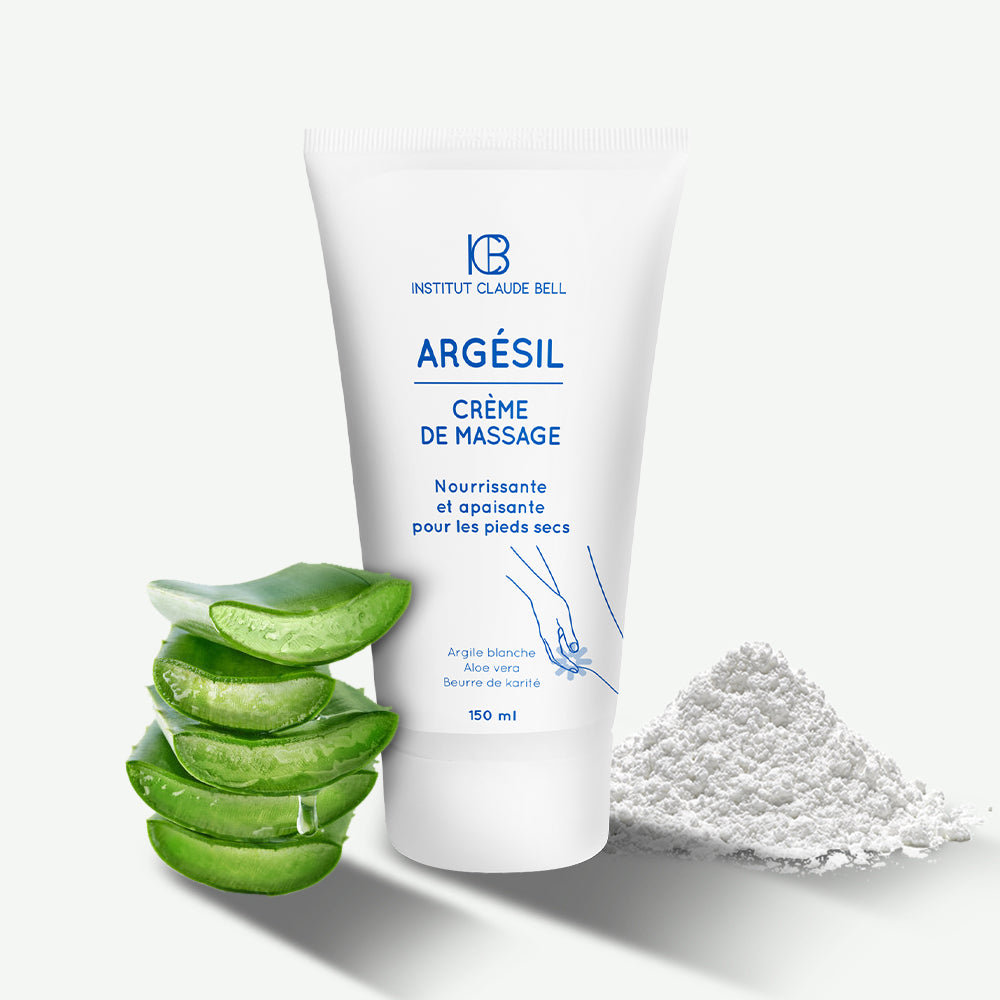 ARGÉSIL crème nourrissante pieds secs est composée d’argile blanche, Aloe vera et beurre de karité respecte l’épiderme de la peau et lui redonne un grain soyeux et souple.