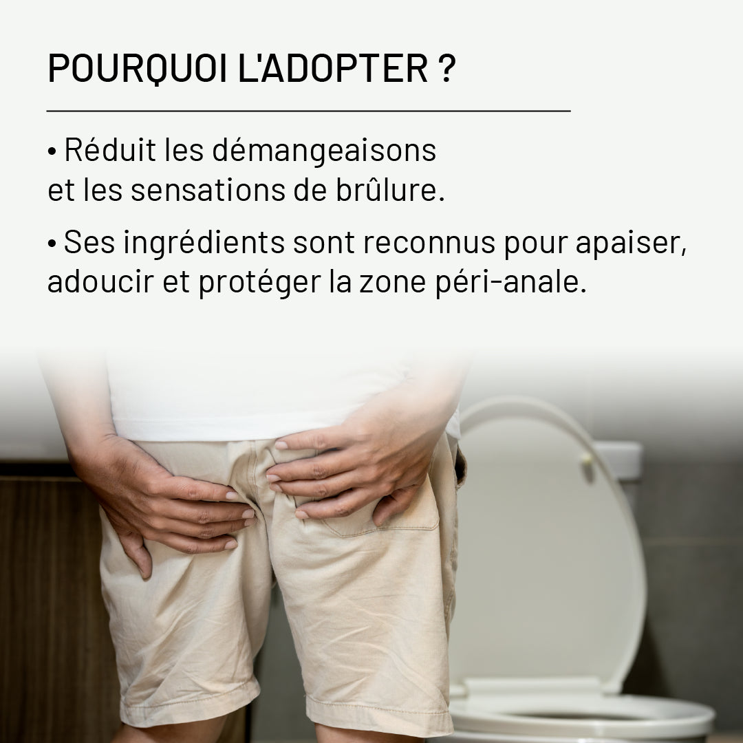 Réduit les démangeaisons et les sensations de brûlure. Ses ingrédients sont reconnus pour apaiser, adoucir et protéger la zone péri-anale.