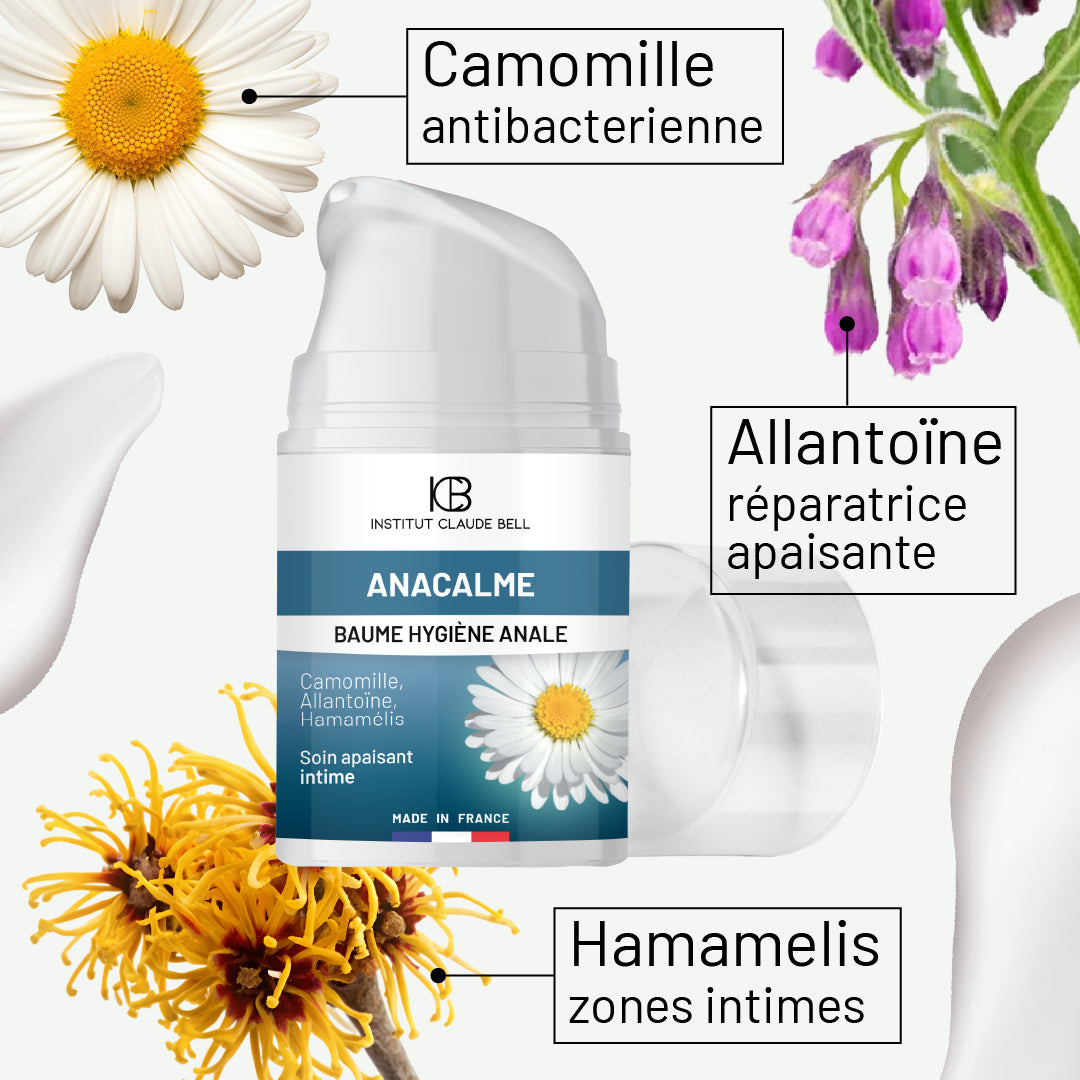 Réduit les démangeaisons et les sensations de brûlure. Ses ingrédients sont reconnus pour apaiser, adoucir et protéger la zone péri-anale.- Camomille : Réputée et reconnue comme étant tonique et calmante. Elle contient du bisabolol, une substance ayant des propriétés apaisantes et antibactériennes.